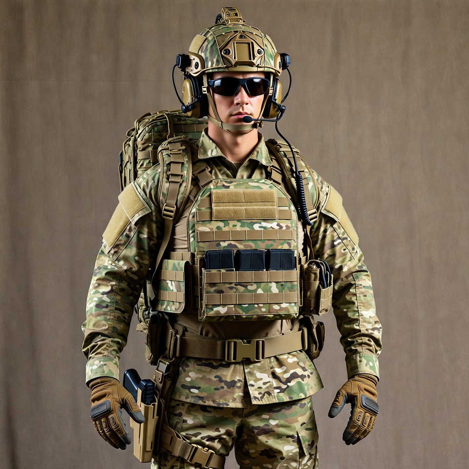 A male soldier stands in full tactical gear against a beige background. He wears a camouflaged uniform, plate carrier, backpack, and tan gloves, holding a pistol at his side. His helmet includes sunglasses, headphones, and a microphone.