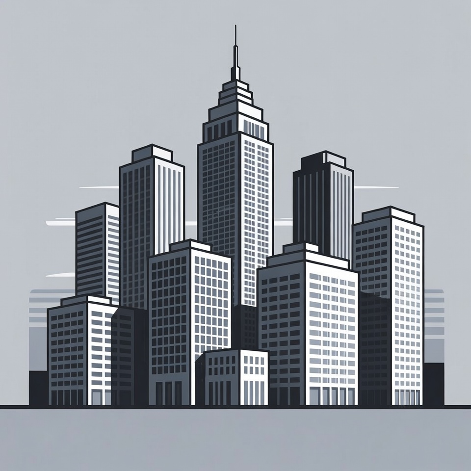 A minimalist line art illustration depicts a cluster of tall skyscrapers forming a city skyline. The central building features a tall spire, surrounded by various modern high-rises with clean outlines. The entire scene is rendered in black and white on a light gray background.