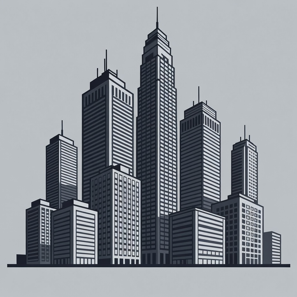 A collection of tall skyscrapers forms a city skyline in a minimalist black silhouette against a light gray background. The buildings vary in height with pointed spires and rectangular shapes. The illustration features clean lines and no color details.