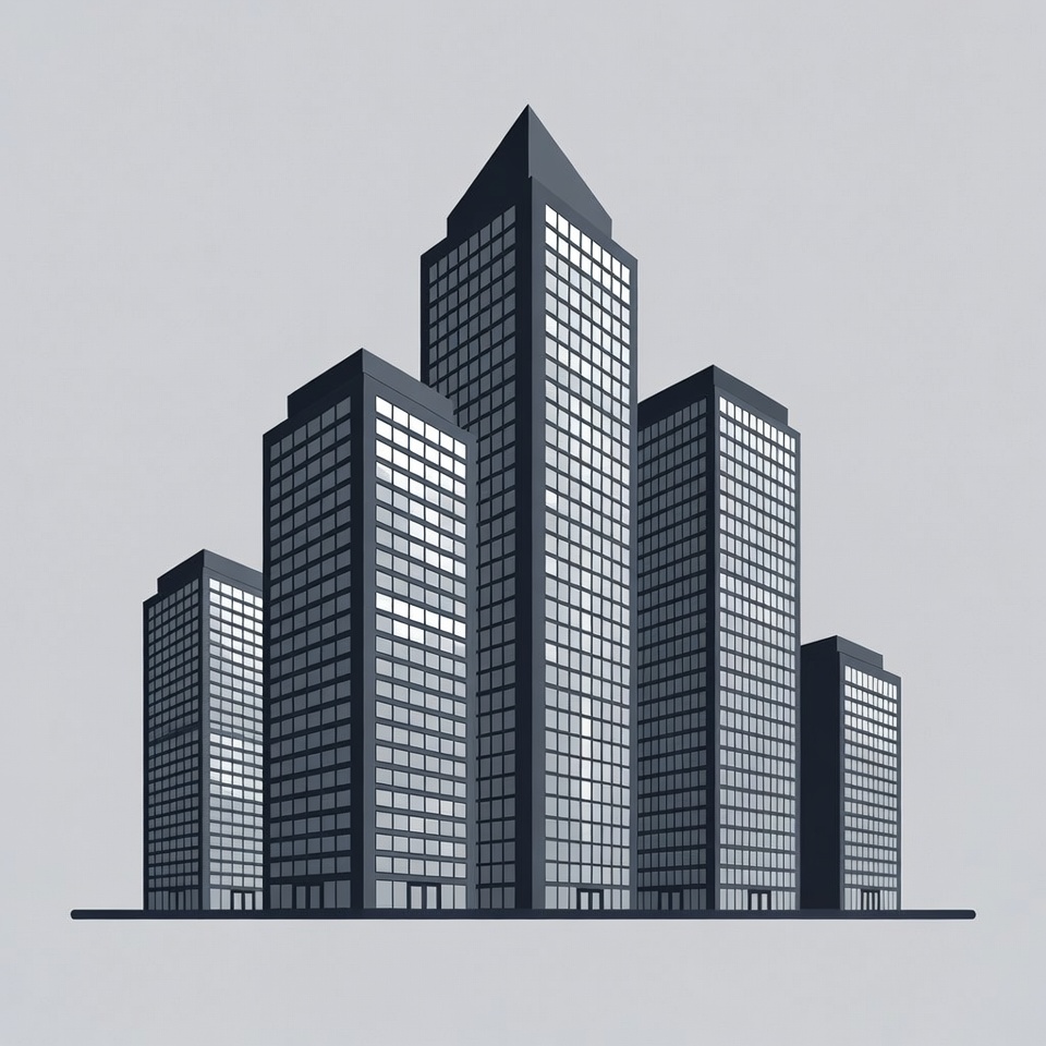 A group of modern high-rise skyscrapers forms a city skyline in a minimalist 3D illustration. The buildings feature reflective glass windows and sharp angular roofs on a plain gray background. The design uses grayscale tones with clean lines and subtle shading.