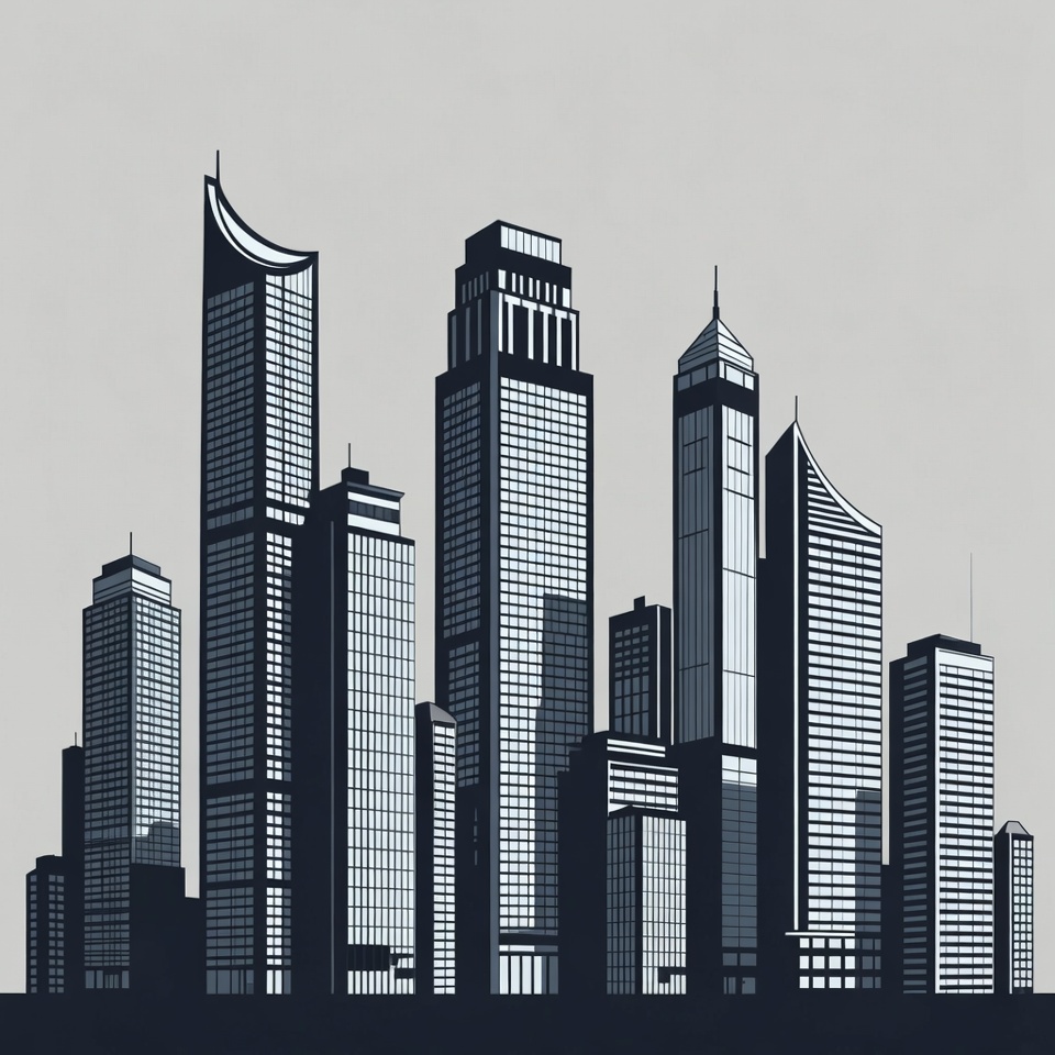 A minimalist black silhouette illustration of a modern city skyline features numerous tall skyscrapers with varied architectural designs. The buildings have sharp, angular shapes and pointed spires against a light gray gradient background. The vector-style graphic emphasizes clean lines and high-rise structures.