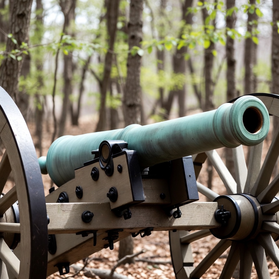 artillery, artillery piece, battlefield relic, cannons, civil war cannon, forest, green leaves, gun, historical weapon, metal barrel, military history, nature, outdoor, spring forest, trees, vintage cannon, wooden wheels, woodland, woods, cannon