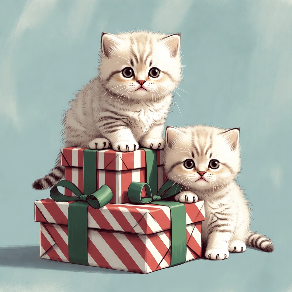 British Shorthair, Christmas kittens, Christmas presents, big eyes, cats, cute kittens, digital art, fluffy kittens, gift boxes, gift stack, green ribbons, holiday gifts, illustration, isolated background, playful cats, red gifts, stacked presents, two kittens, white kittens, kittens