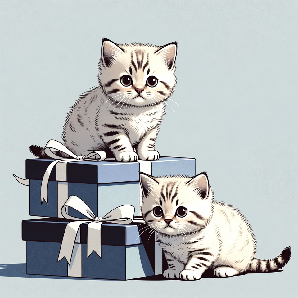 Two adorable tabby kittens with white fur and black stripes sit on stacked gift boxes wrapped in blue and black paper with ribbons. The kittens have large expressive eyes and fluffy fur, positioned one atop the other on a light blue isolated background. The illustration style features detailed shading and a cute, playful arrangement.