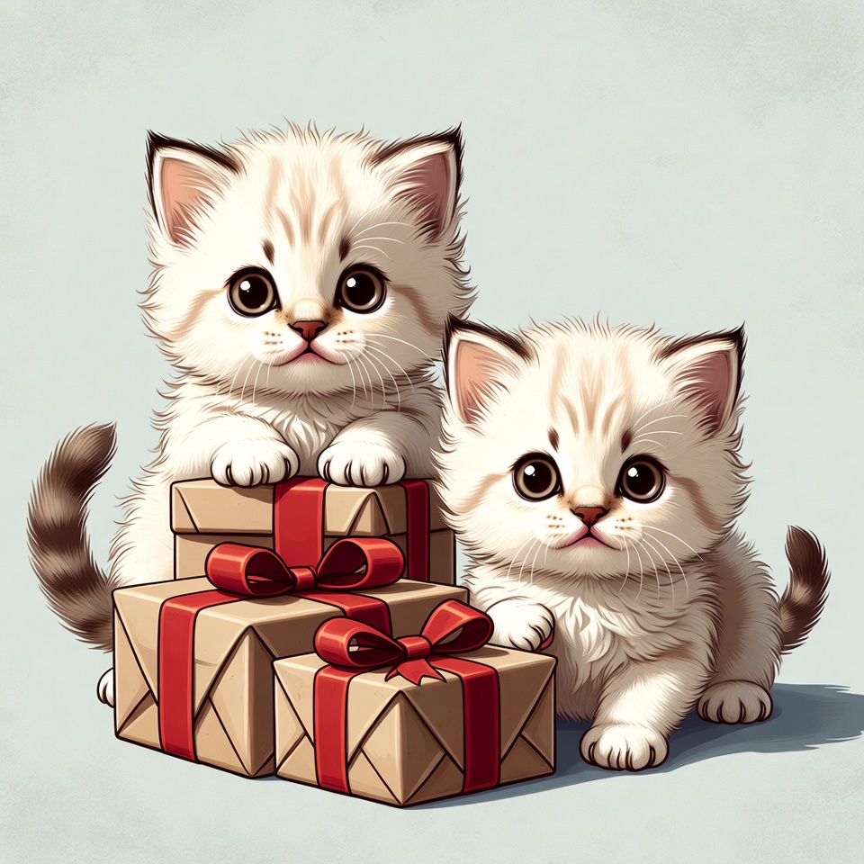 Two fluffy white kittens with light tabby markings sit playfully in front of stacked Christmas gift boxes wrapped in red ribbons. The kittens have large expressive eyes and fluffy tails, posed on a light blue background. The illustration features detailed fur and shiny gift wrapping.