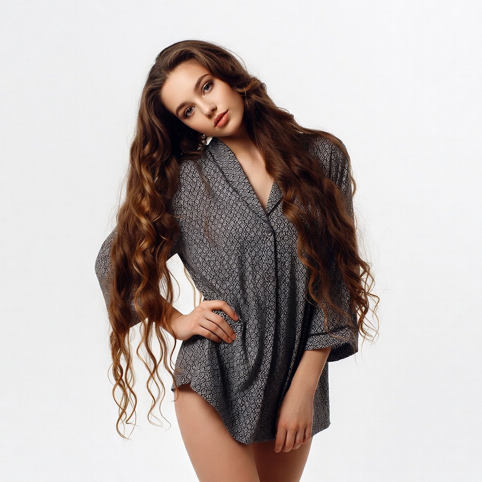 A young woman with long wavy brown hair poses seductively on a white background. She wears a loose-fitting gray patterned shirt with a deep V-neck, unbuttoned to reveal cleavage and bare legs. Her head is tilted, one hand on her hip, and the other relaxed by her side.