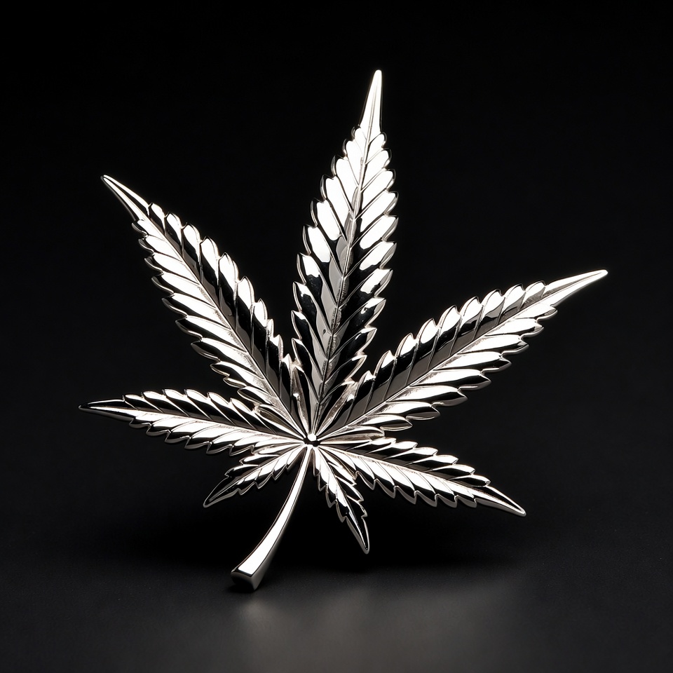 A detailed silver marijuana leaf with intricate engravings sits against a solid black background. The leaf features multiple serrated leaflets radiating from a central stem, rendered in a metallic 3D style. It appears as a polished brooch or pendant isolated on the dark surface.