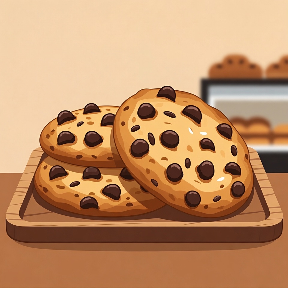 baked goods, bakery, chocolate, chocolate chips, clipart, cookies, counter, dessert, food, golden brown, illustration, isolated background, plate, shelf, stack, wooden plate, chocolate chip cookies