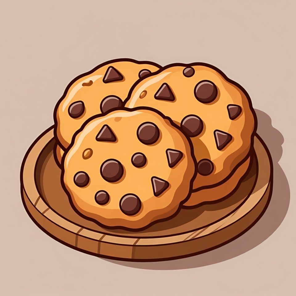 Three golden chocolate chip cookies with dark chocolate chunks are stacked on a wooden plate. The cookies feature irregular edges and prominent chocolate pieces. The illustration is set against a light beige background.