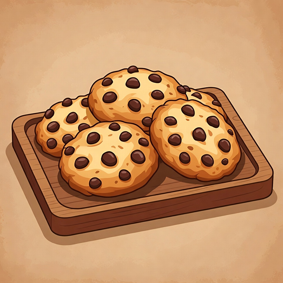 A stack of golden chocolate chip cookies sits on a wooden board. The cookies feature dark chocolate chips embedded in soft dough with textured edges. The illustration has a warm beige background.
