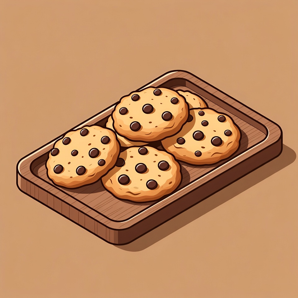 A stack of golden chocolate chip cookies with visible dark chips sits on a rectangular wooden platter. The illustration features a simple beige background with subtle shadows for a 3D effect. The cookies are arranged neatly in a pile.