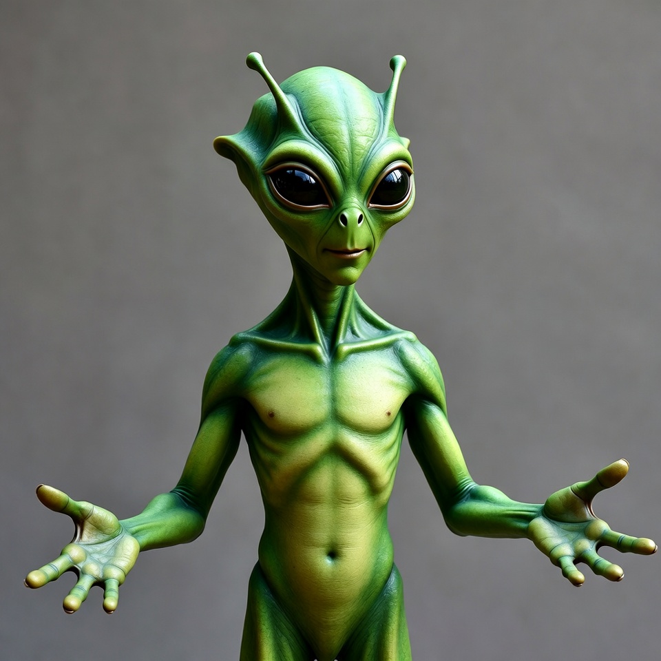 UFO creature, antennae, black eyes, extraterrestrial, figurine, gray background, green alien, humanoid, illustration, isolated, large head, muscles, outstretched arms, sci-fi, slim body, alien