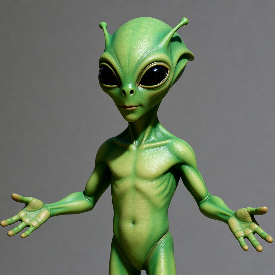 A detailed green alien figure stands with slender arms outstretched and large black eyes. It has an elongated head with antennae and a smooth, shiny green skin texture. The alien is posed against a plain gray background.