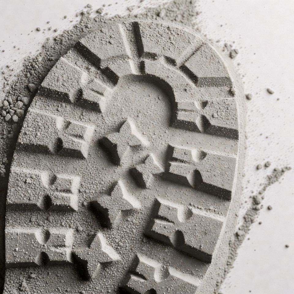 boot sole, close-up, crime scene, dust, evidence, footprint, gray dust, grayscale, hiking boot, impression, isolated background, lug pattern, monochrome, powder, shoe print, texture, track, tread mark, work boot, boot print