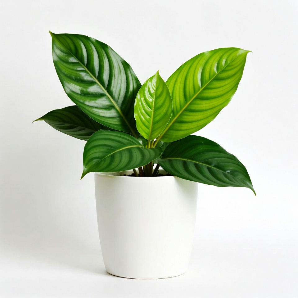 foliage, glossy leaves, green leaves, houseplant, indoor plant, isolated background, plant, potted plant, tropical plant, veined leaves, white pot, Calathea