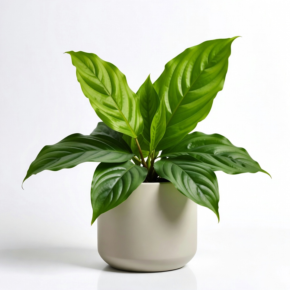 ceramic pot, foliage, gray pot, green leaves, houseplant, indoor plant, isolated background, plant, potted plant, tropical plant, wavy leaves, calathea