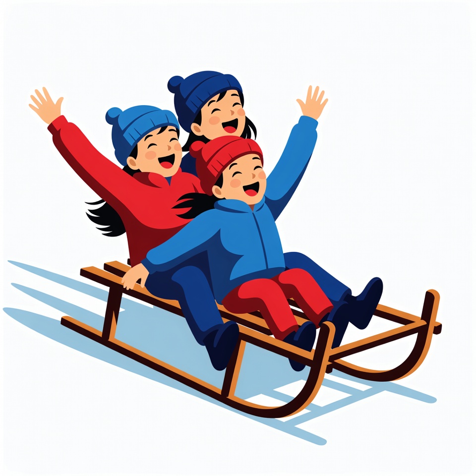 Asian children, arms raised, blue jacket, boy, cartoon illustration, cheerful children, clipart, excited kids, family fun, girl, happy kids, isolated background, kids playing, knit beanie, outdoor winter, red jacket, sled ride, sledding, smiling faces, snowy slope, three children, vector art, winter fun, wooden sled, kids sledding
