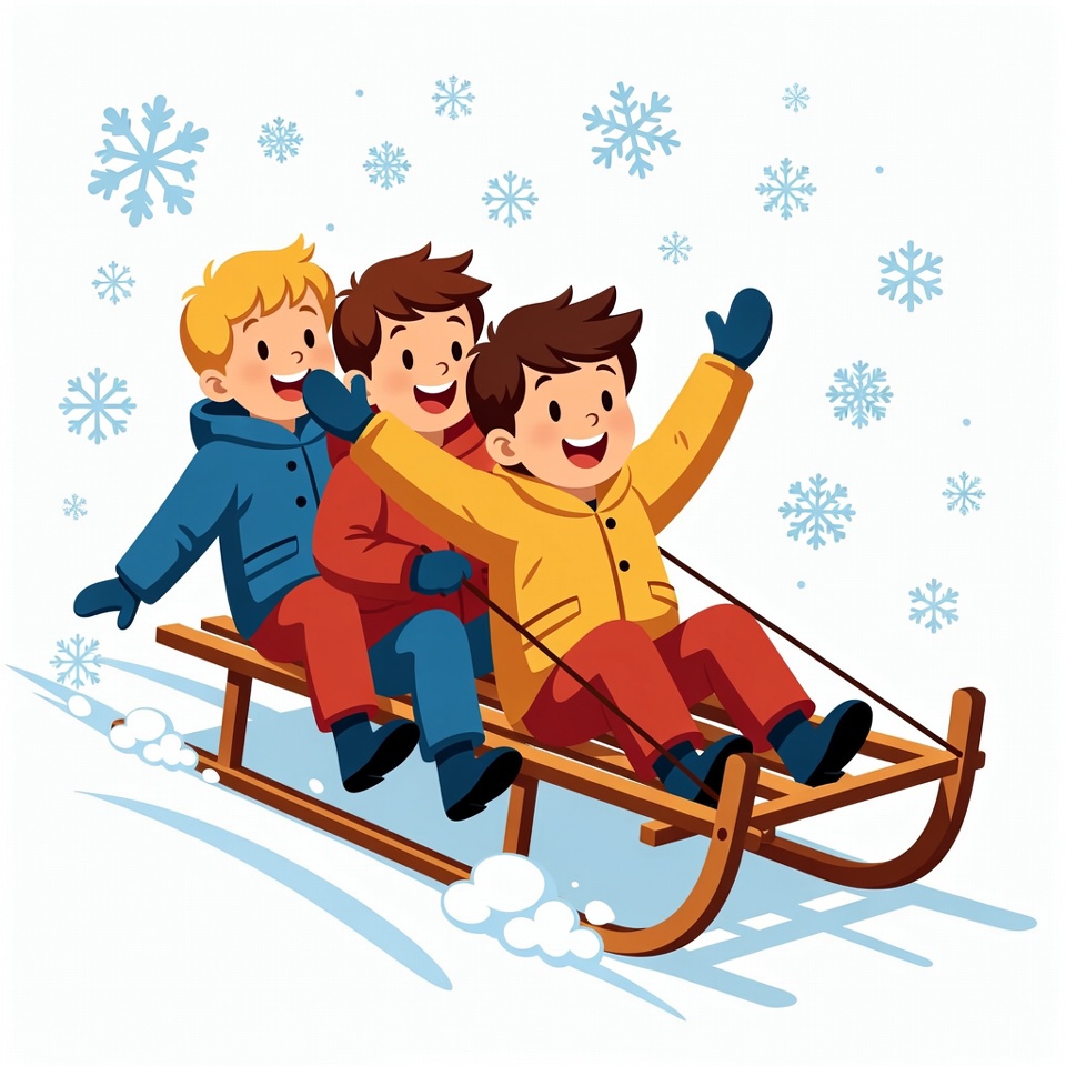 Three cartoon boys with blonde and brown hair ride a wooden sled down a snowy hill. They wear colorful winter jackets, pants, and gloves, smiling happily with arms raised. Snowflakes surround them on a white background.