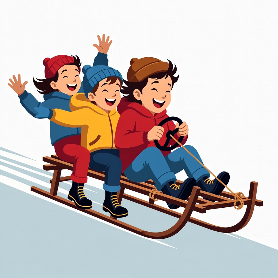Three joyful children sled down a snowy hill on a wooden toboggan. The girl with red hat and blue jacket waves excitedly on one side, while the boy in yellow jacket and the boy in red jacket gripping the steering wheel laugh happily. They wear colorful winter jackets, pants, and boots against a white background.