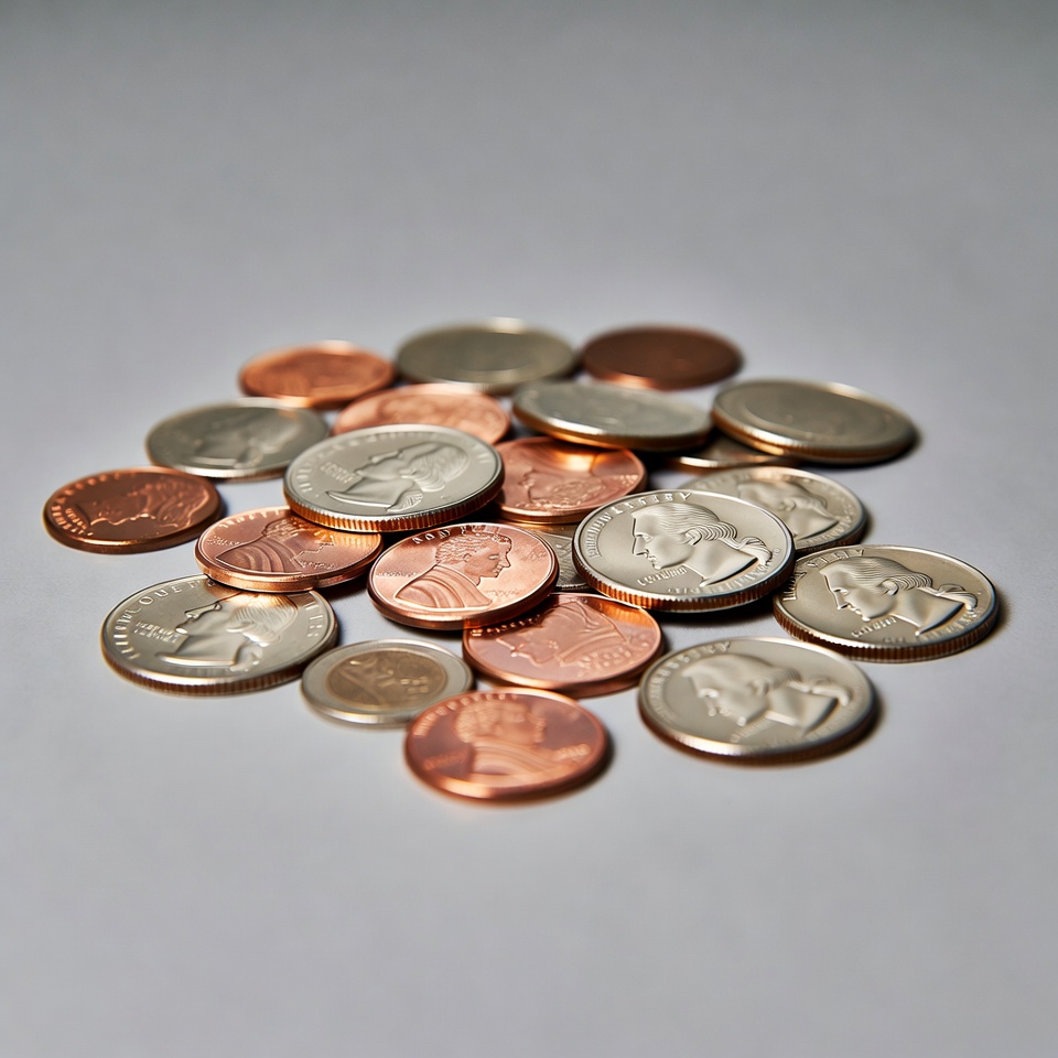 A pile of assorted US coins rests on a gray surface. Copper-colored pennies feature Abraham Lincoln's profile, while silver quarters show George Washington's face. The coins are scattered in a clustered arrangement against a plain background.
