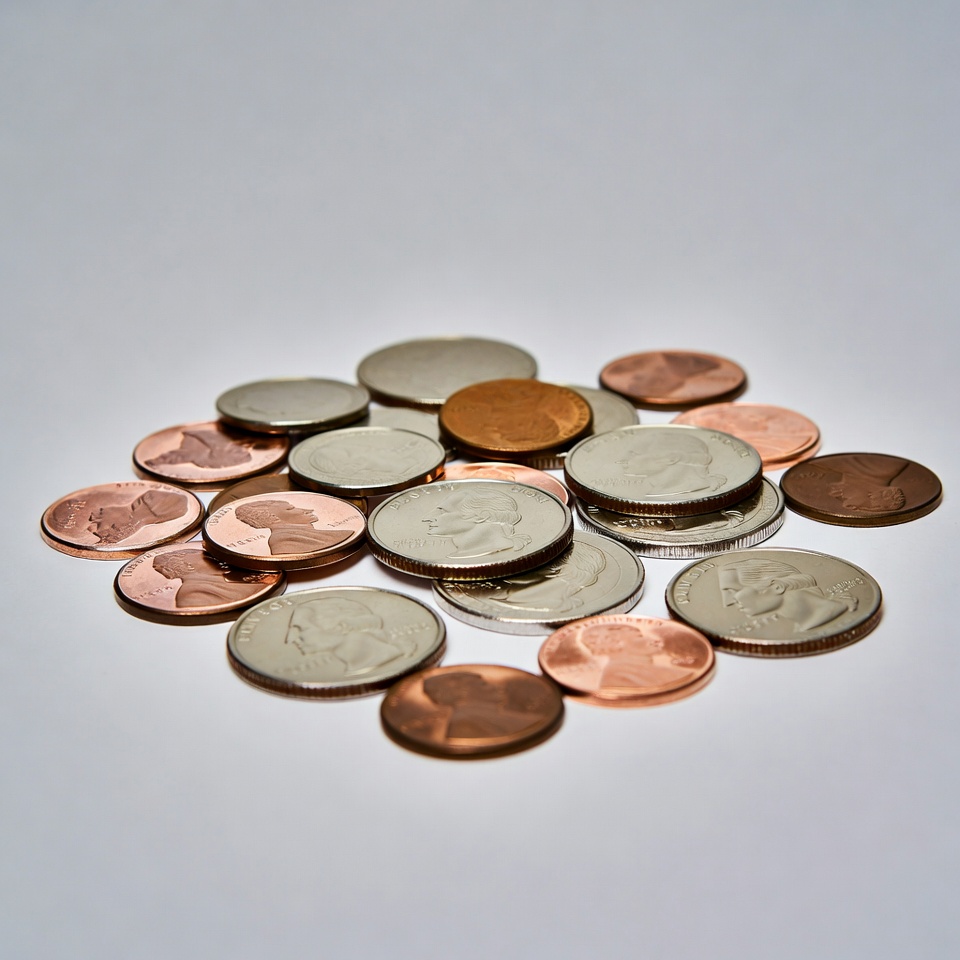 A pile of assorted US coins is arranged in a circular formation on a white background. The collection includes shiny silver quarters, dimes, and nickels alongside copper pennies and golden dollar coins. The coins are stacked and scattered, showcasing their metallic edges and engraved portraits.