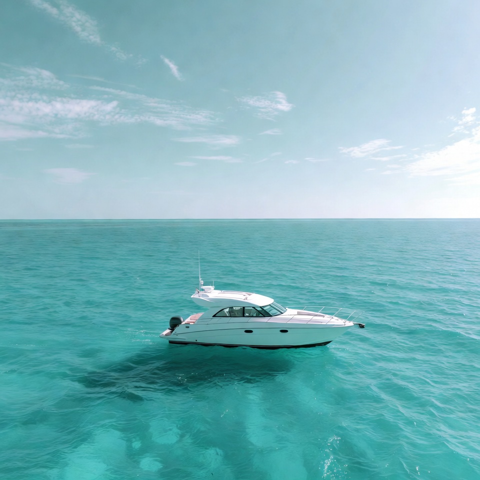 antenna, blue sky, boat on water, boating, cabin boat, clear water, cloudy sky, luxury boat, marine, nautical, ocean, outboard motor, sea, speedboat, tropical sea, turquoise water, vessel, watercraft, white boat, yacht, motorboat