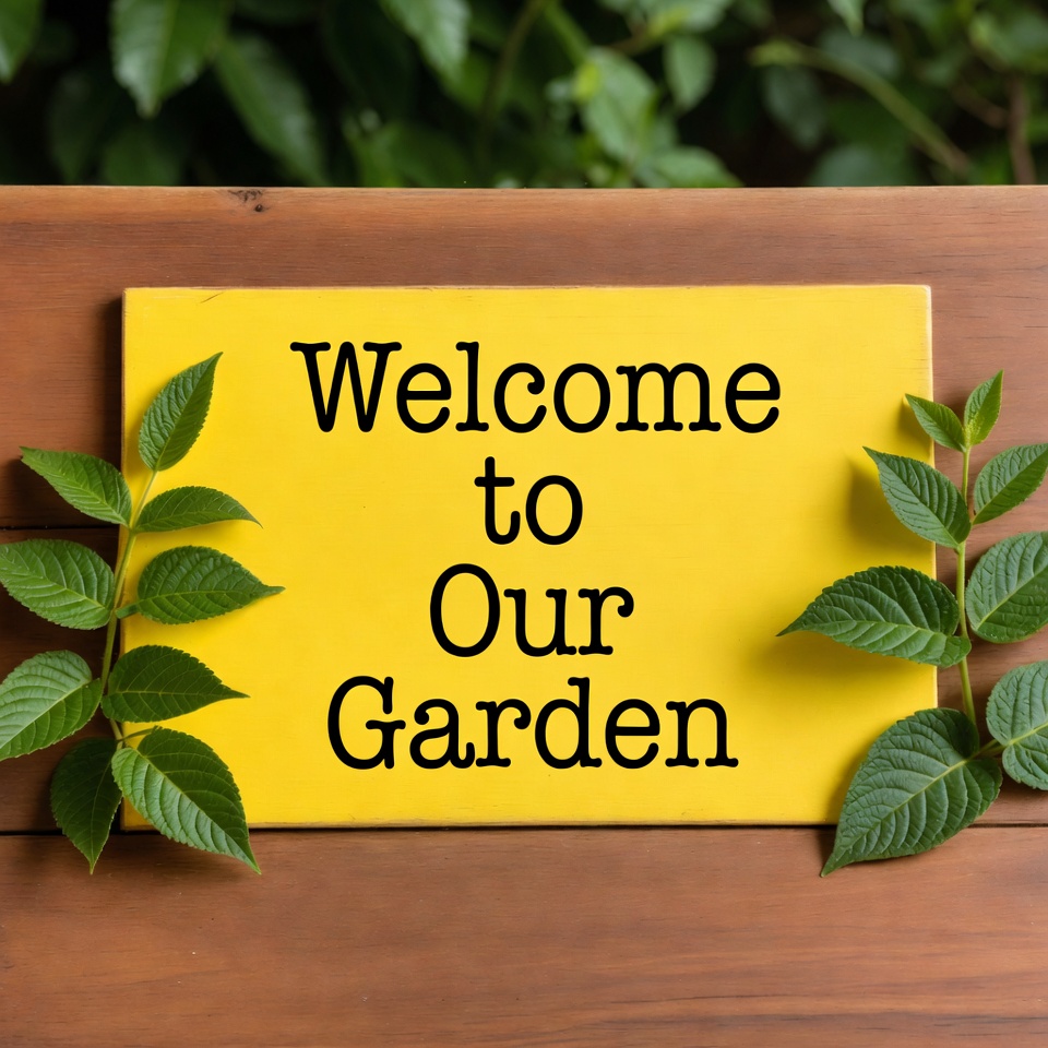 A yellow sign reading 'Welcome to Our Garden' sits on a wooden surface. Green leaves frame the sign on all sides. The background features additional lush green foliage.