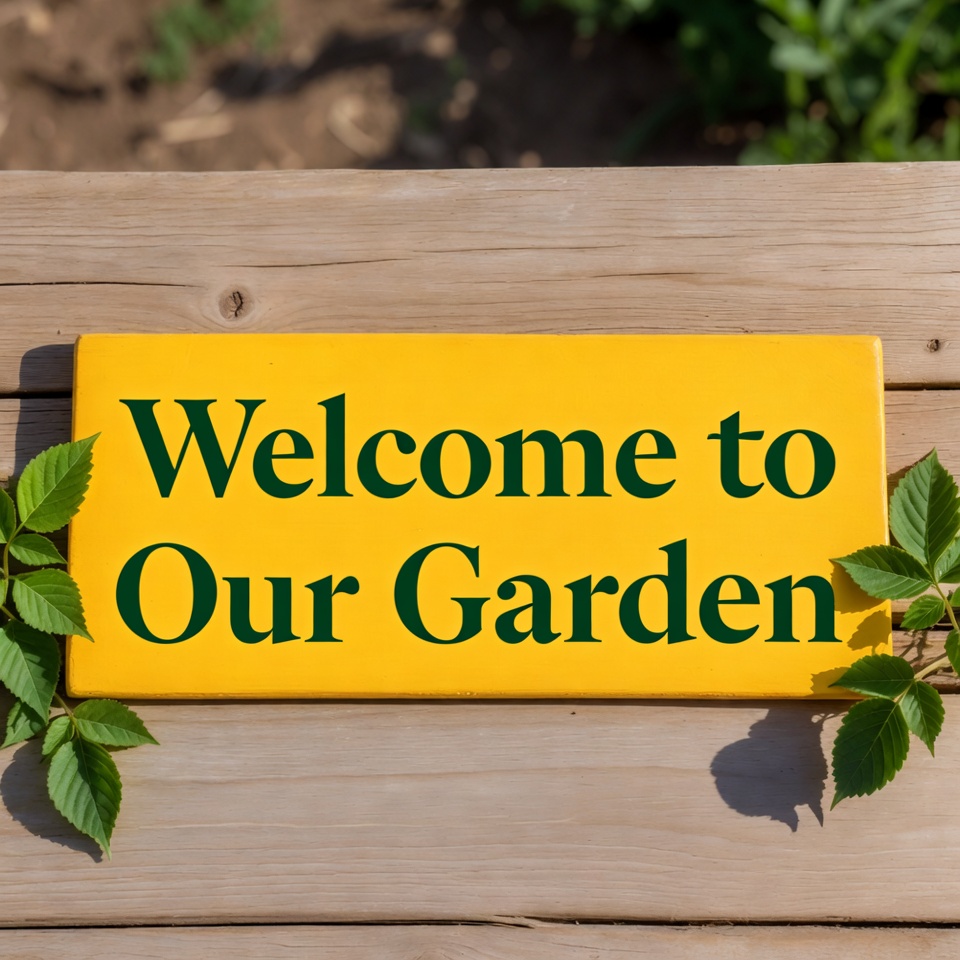 A yellow rectangular sign reading 'Welcome to Our Garden' in bold black letters sits on a wooden garden bench. Green leaves frame the sign on both sides. The background features soil, plants, and greenery.