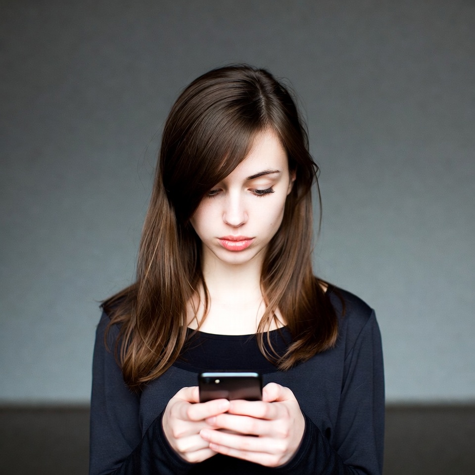 A young woman with long brown hair looks down at her smartphone. She wears a black top and holds the phone with both hands. The image features a plain gray background.