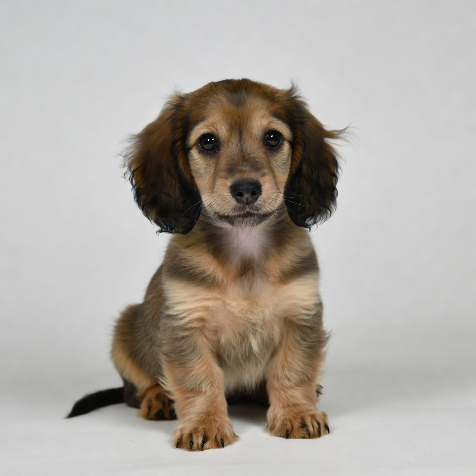 A fluffy brown Dachshund puppy sits on a white background. The puppy has long ears, big expressive eyes, and a playful expression. Its fur features shades of red-brown and black with white markings on the chest.