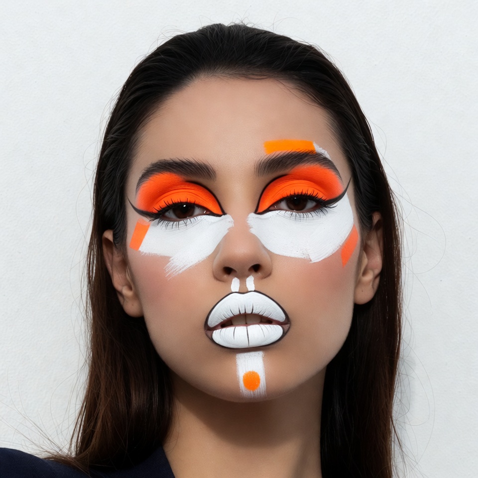 A woman with long dark wet hair poses against a white background, featuring bold orange and white face paint. Her eyes are dramatically lined with orange eyeshadow and black liner, and white paint covers her cheeks, nose, and lips. She wears a dark top and has a striking, artistic makeup look.