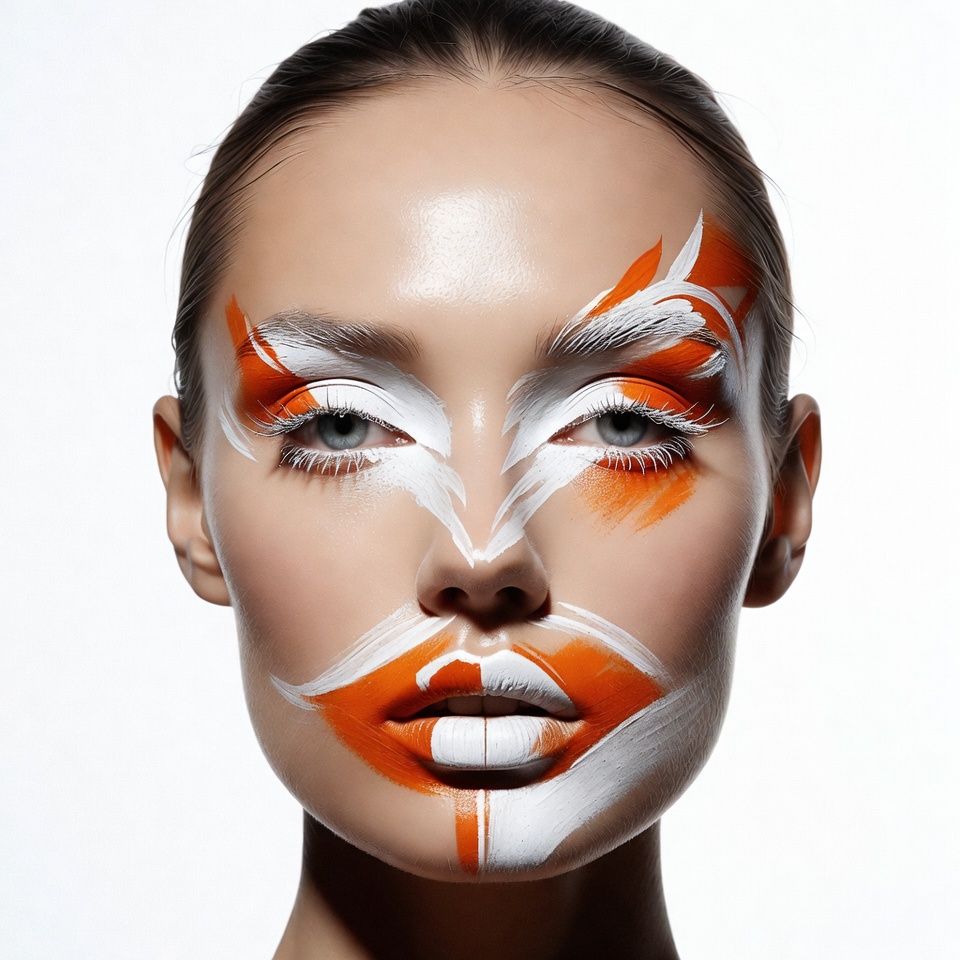 A young woman with smooth skin and hair in a bun stares directly at the camera. Her face is adorned with bold artistic makeup featuring white and orange stripes, swirls, and patterns across her cheeks, eyes, and lips. The image is set against a plain white background.