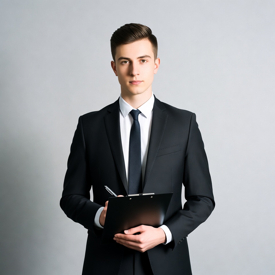 A young man with short dark hair stands confidently against a plain gray background. He wears a black suit, white dress shirt, and black tie. He holds a black clipboard with a pen clipped to it in both hands.