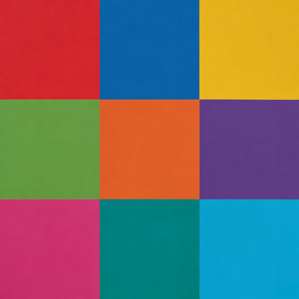 A 3x3 grid displays solid colored squares in vibrant hues. The squares include red, blue, yellow, green, orange, purple, pink, teal, and cyan. Each square fills its position uniformly without patterns or text.