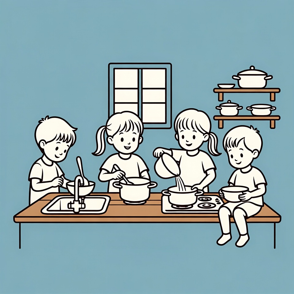 Four cartoon children collaborate in a kitchen, with two girls stirring pots on a stove and two boys washing dishes at the sink and holding a bowl. They wear simple white shirts and shorts, smiling happily. The scene features a wooden table, white pots, a window, and shelves on a light blue background.