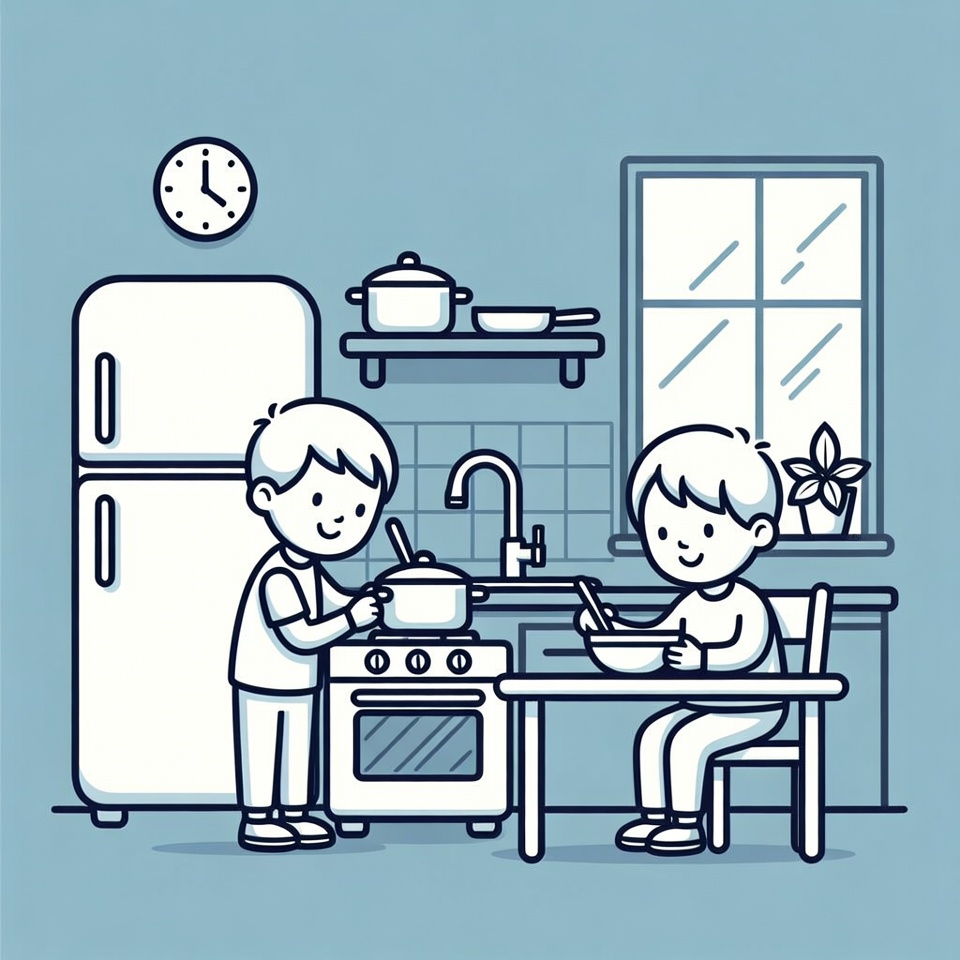 bowl, boys, chair, clock, cooking, eating soup, isolated background, kitchen, line art, male, refrigerator, shelves, spoon, stirring pot, stove, table, utensils, window, young boys, illustration