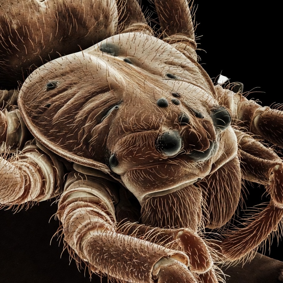 A detailed macro photograph captures the hairy face and legs of a spider against a solid black background. The spider's brown fur, multiple eyes, and chelicerae are sharply visible. Fine hairs cover its cephalothorax and appendages.