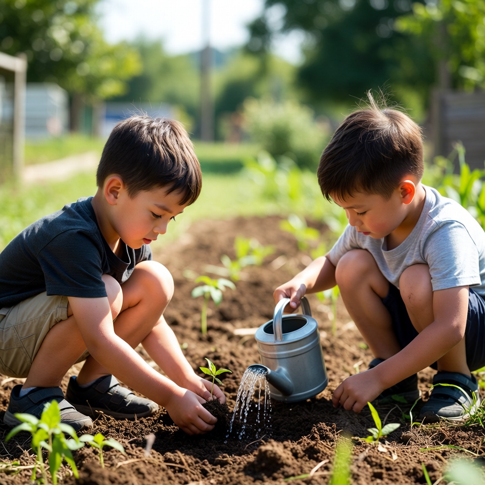 Two young Asian boys kneel in a garden bed, watering small green seedlings with a metal watering can. One boy in a black t-shirt and khaki shorts pours water from the can, while the other in a gray t-shirt and blue shorts plants a seedling nearby. They are surrounded by soil, plants, and a wooden fence under a sunny sky.