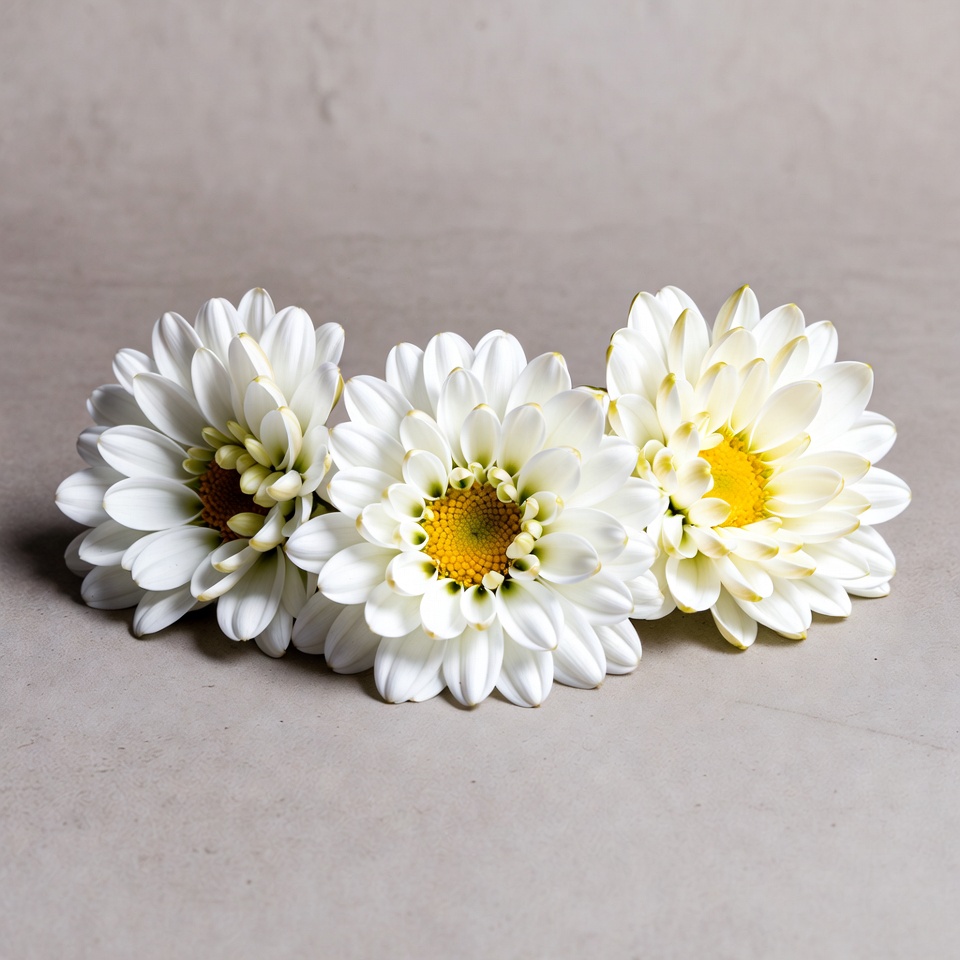Three white daisies with yellow centers are arranged closely together on a smooth light gray background. Each flower features layered white petals surrounding a bright yellow disc. The composition is simple and isolated, highlighting the delicate blooms.