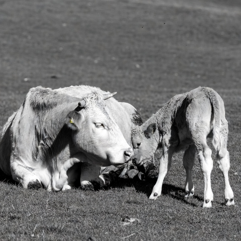 animal mother, animals, baby cow, black and white, bovine, calf, farm animal, field, grass, horns, livestock, lying cow, mother cow, nuzzling, pasture, rural, sepia tone, standing calf, young calf, cow