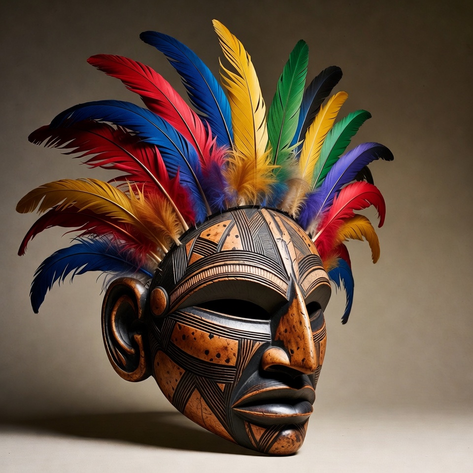 African mask, art, blue feathers, carved face, colorful feathers, cultural artifact, decorative mask, ethnic mask, feathered mask, feathers, green feathers, isolated background, mask face, red feathers, sculpture, traditional mask, tribal art, wooden mask, yellow feathers, tribal mask