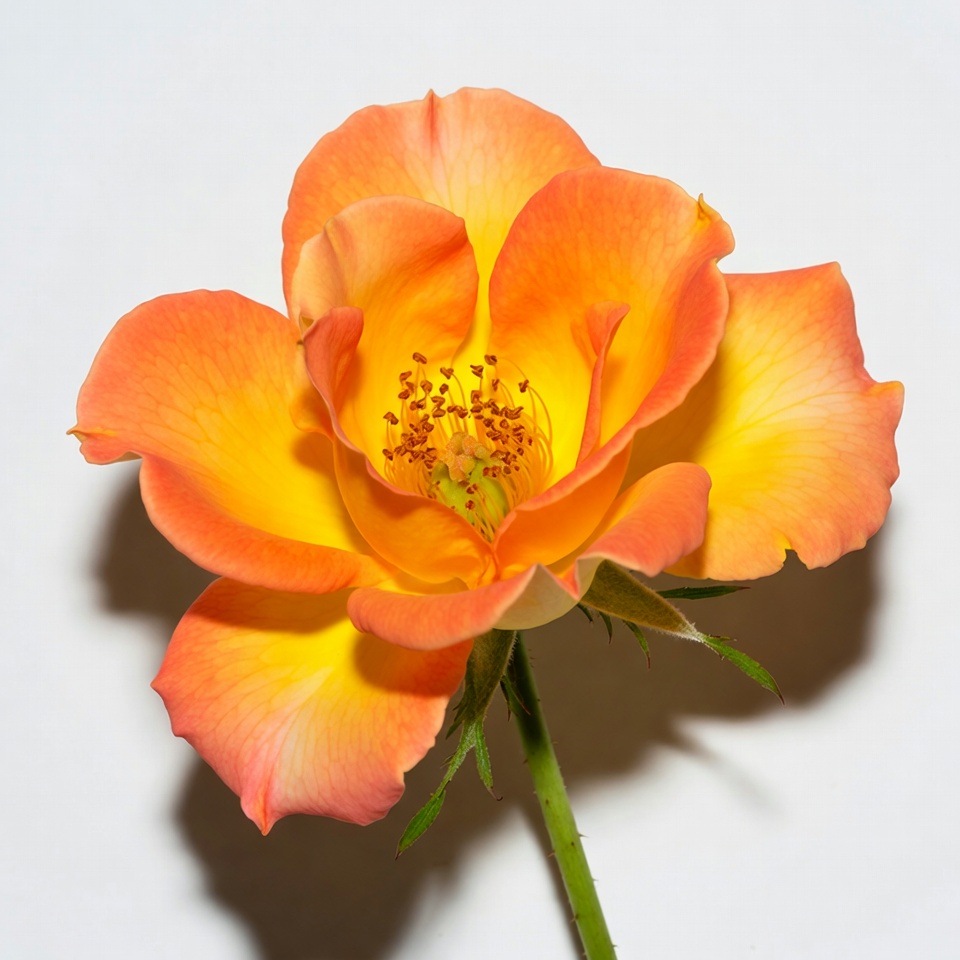 bloom, botany, closeup, floral, flower, flower closeup, fresh rose, garden flower, green stem, hybrid rose, isolated, macro flower, nature, orange bloom, orange petals, petals, rose bloom, rose flower, single rose, stamen, vibrant flower, white background, yellow center, orange rose