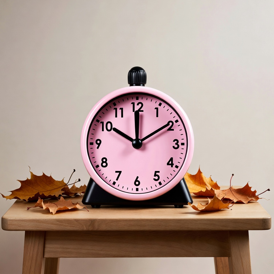 A pink analog alarm clock displays 9:15 on a wooden table. It features black hands and numbers on a round pink face with a black top handle. Surrounding the clock are scattered orange autumn leaves on a neutral background.