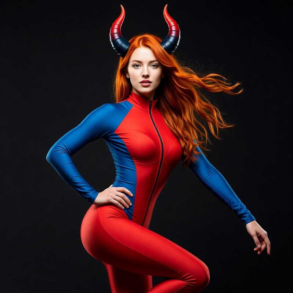 A woman with long wavy red hair wears red demon horns on her head and poses confidently against a black background. She is dressed in a form-fitting blue and red zip-up bodysuit with long sleeves. Her hand rests on her hip while her red hair flows dynamically.
