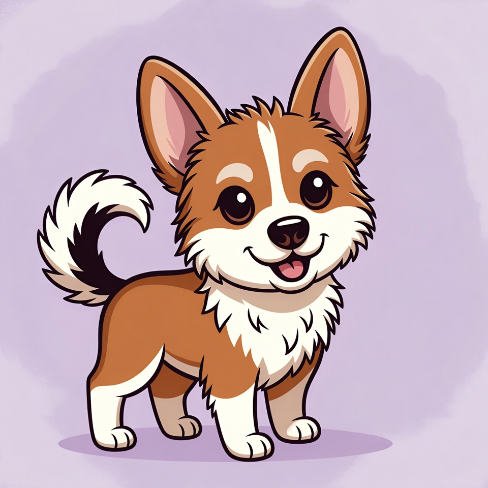 A cute cartoon illustration of a corgi puppy with brown and white fur stands on a purple background. The puppy has large expressive eyes, perky ears, a fluffy tail, and a happy smile with its tongue out. It is depicted in a chibi style with soft outlines and vibrant colors.