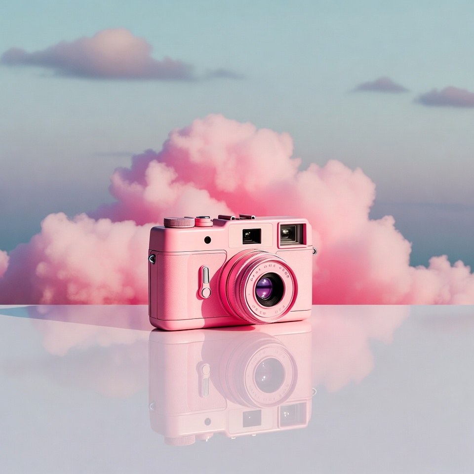 A pink vintage-style camera sits on a reflective white surface with its reflection below. Fluffy pink clouds float in a pastel blue sky behind it. The camera features a prominent lens and compact design.