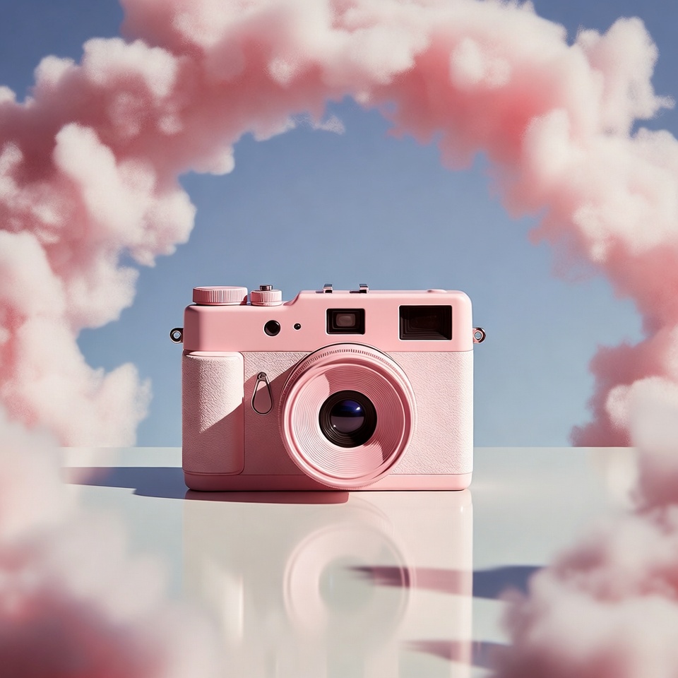 A pink vintage-style camera sits on a reflective white surface. Fluffy pink clouds form an arch around it against a blue sky background. The camera features a large lens and leather texture details.