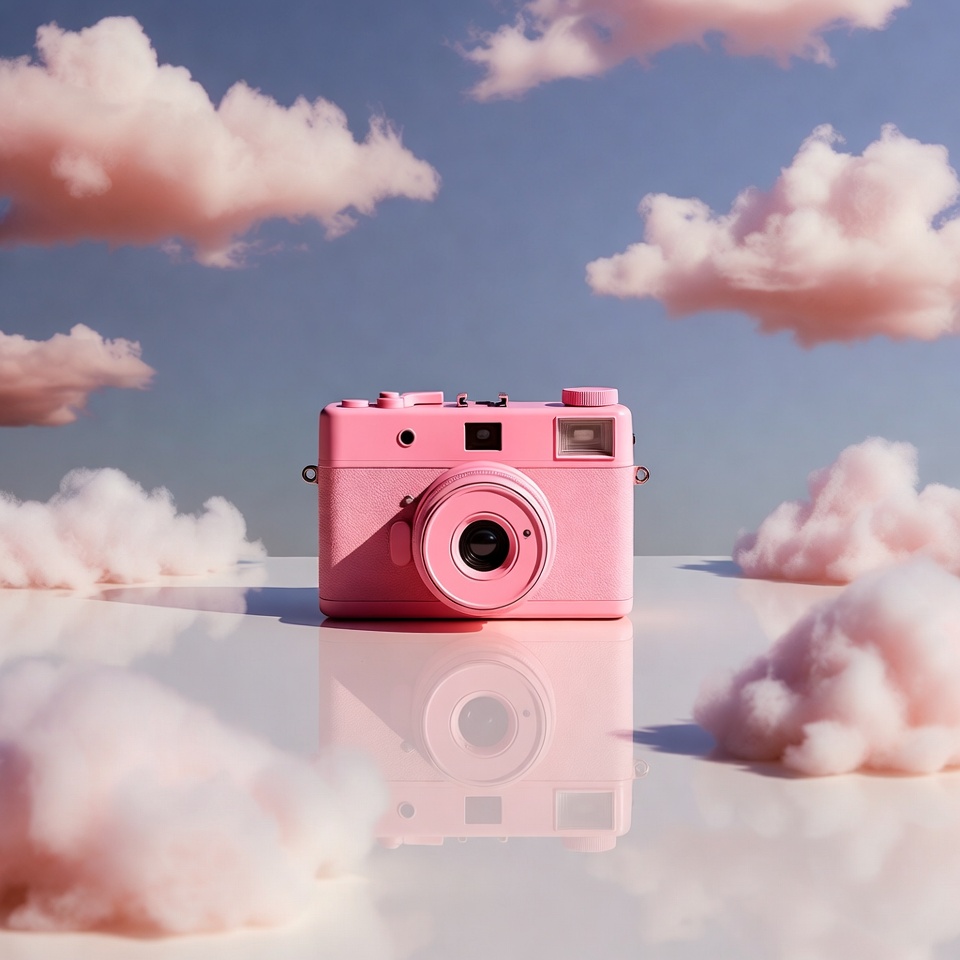 A pink instant camera sits centered on a reflective white surface surrounded by fluffy pink and blue clouds. The camera features a rounded lens and colorful buttons, with its reflection visible below. The dreamy sky background enhances the surreal floating effect.
