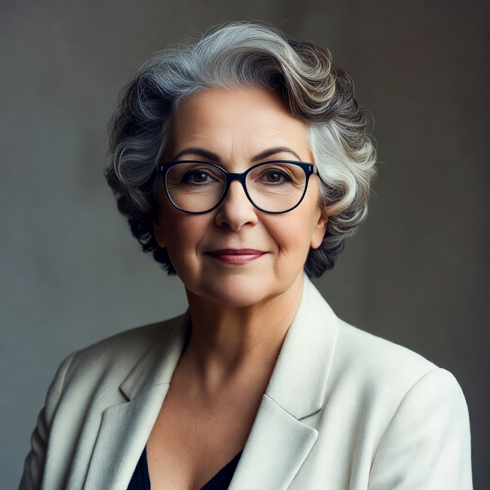 White, black glasses, blazer, close-up, confident woman, elderly woman, eyeglasses, female, glasses, gray background, gray hair, headshot, portrait, senior woman, silver hair, smiling woman, wavy hair, white blazer, woman