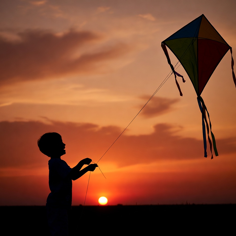 A silhouette of a young boy stands in a field, flying a colorful kite with red, yellow, green, and blue panels. The scene is set against a vibrant orange sunset sky with the sun low on the horizon. The boy holds the kite string firmly as the kite soars high above.
